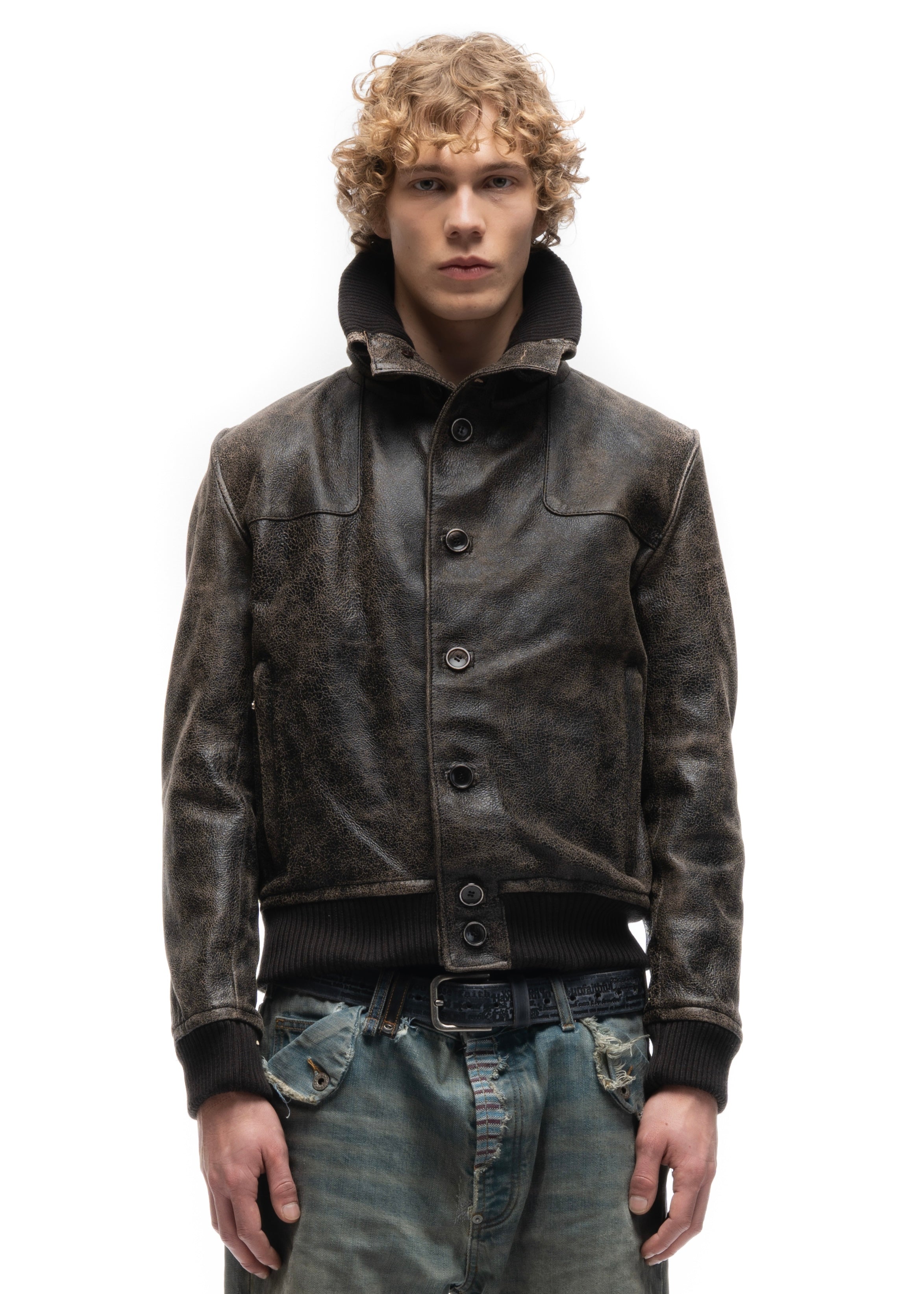 COLLAR UP BUTTON LEATHER JACKET CRACKED USED